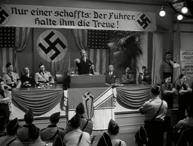 Kassel believes that German Americans like himself must save America from chaos and racial defilement and lead it into a mutually beneficial alliance with Germany. He promotes “Americanism,” but rails against the U.S. constitution and the Bill of Rights. Oddly enough, he does not mention Jews in his tirades. Presumably, Warner Bros. deliberately kept Jews out of the picture so as to universalize the danger that Nazis posed to all Americans.