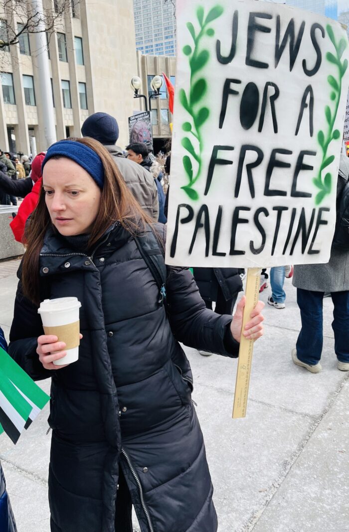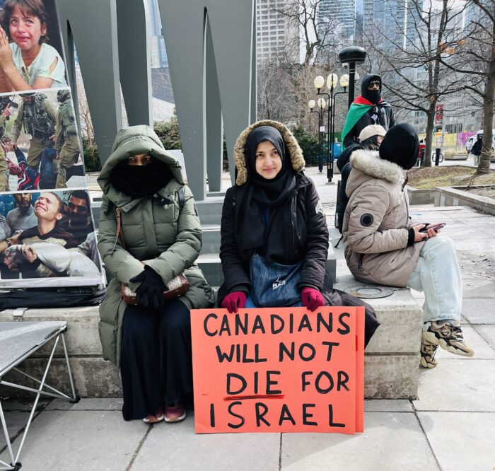Two women sat beside another provocative sign, “Canadians will not die for Israel.”