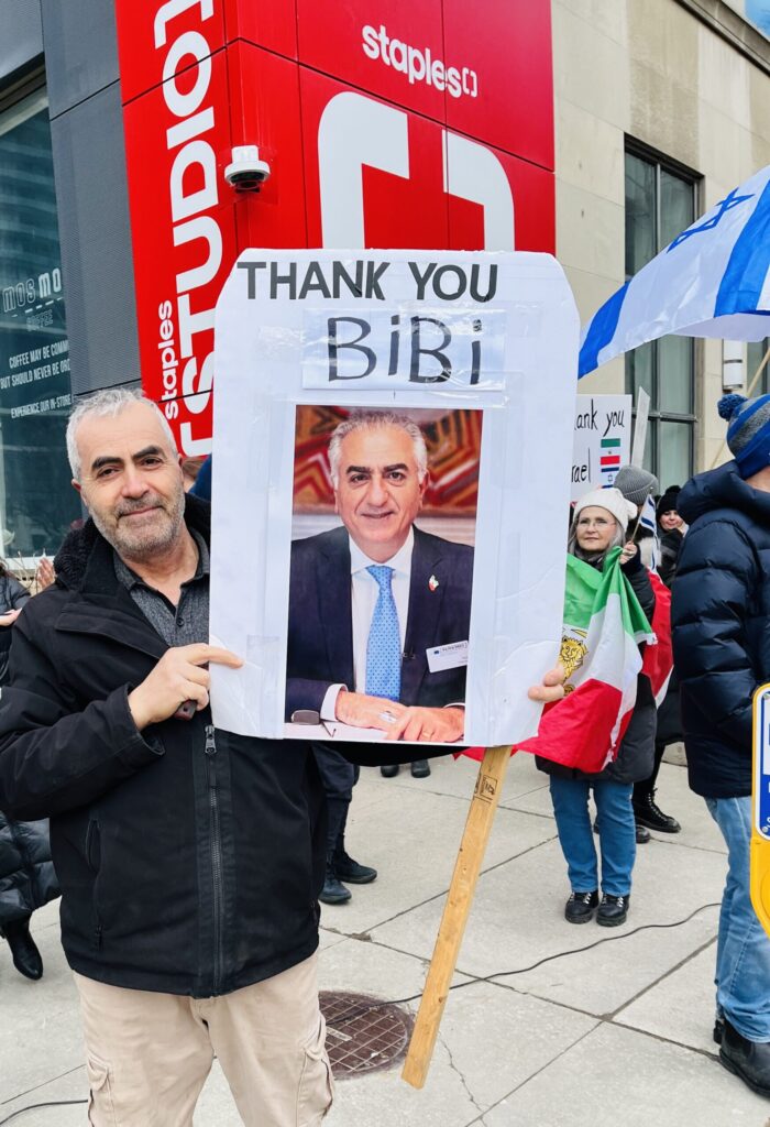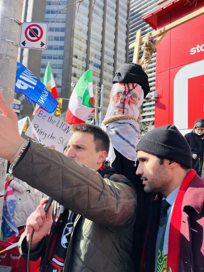 One protester brandished an effigy of the late Iranian leader. Two others held up signs reading, “Thank you, Bibi” — a reference to Israeli Prime Minister Benjamin Netanyahu — and “We won’t let Islamists take over Canada.”