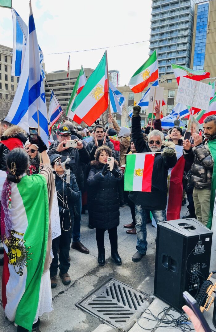 On the north side of University Avenue, major thoroughfare, stood supporters of Israel and Iranian adversaries of the Islamic Republic of Iran, holding aloft the flags of Israel and of the pre-revolutionary Pahlavi monarchy.