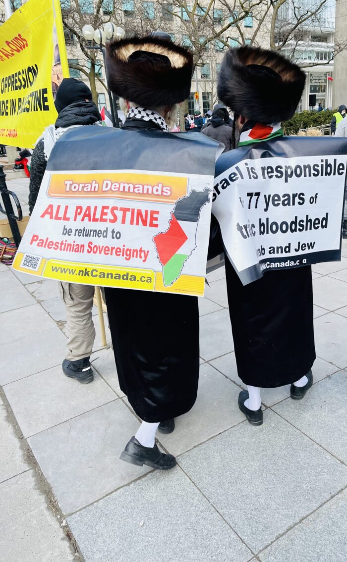 The two representatives from Neturei Karta strolled around with signs on their chests and backs: “Torah demands all Palestine be returned to Palestinian sovereignty. Israel is responsible for 77 years of tragic bloodshed of Arab and Jew.”